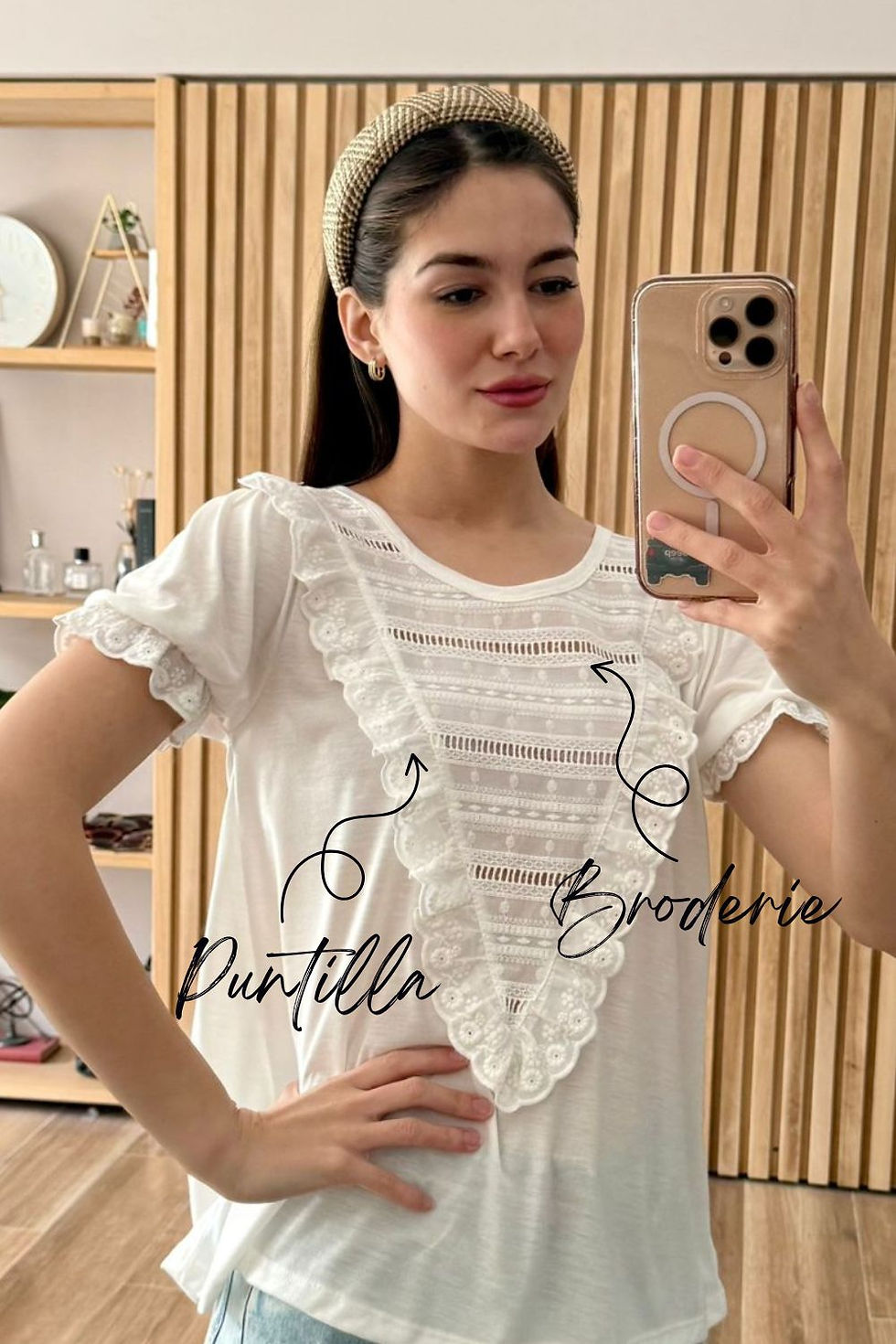 Blusa Delantera en Brod. Alegria mangas princess en Manteca